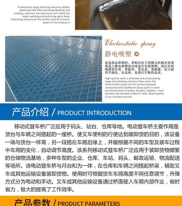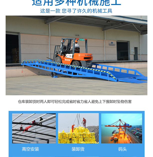 固定式登車橋廣泛應用于碼頭、站臺、倉庫等地。電動登車橋主要作用是貨臺與車輛之間搭起的一座橋。使叉車便利的行使達到裝卸貨的目的,該設備一端與貨臺一樣高,另一段搭在車廂后緣上,并能根據不同的車型及裝車過程中車廂的變化,自動調節高度。